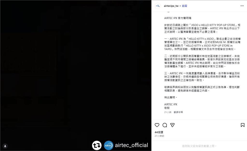 代理商也強調是聯名企劃合法授權管理單位之一。圖/翻攝自Instagram@airtecipx_tw台北/張綺云 責任編輯/施佳宜