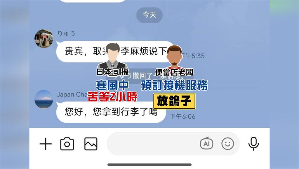 老闆放鴿子,害日本司機在寒風中苦等2小時。圖/台視新聞老闆宣稱,接到電話時被系統提醒「小心詐騙」,才讓他後續沒有和業者聯繫,也承諾會付3萬日圓的車費,希望這件事順利結束,並附上「證明照片」,表示自己沒有說謊。