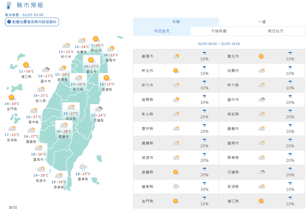 2/5全台天氣預報。圖/中央氣象署此外要留意,金門、馬祖及清晨在西半部地區易有局部霧或低雲影響能見度,請留意航班資訊及行車安全;東南部沿海(含蘭嶼、綠島)、恆春半島則有長浪發生的機率,海邊活動請留意安全。