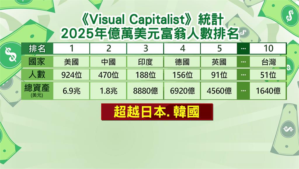 搭上AI 浪潮,台灣的有錢人越來越多?據國外機構統計,2025年各國「億萬美元富翁」人數排名,美國是全球第一,台灣則擠進第10名,一共有51名,超過日本、韓國。但有外媒認為,AI浪潮雖然造就許多富翁,但也造成貧富差距擴大。