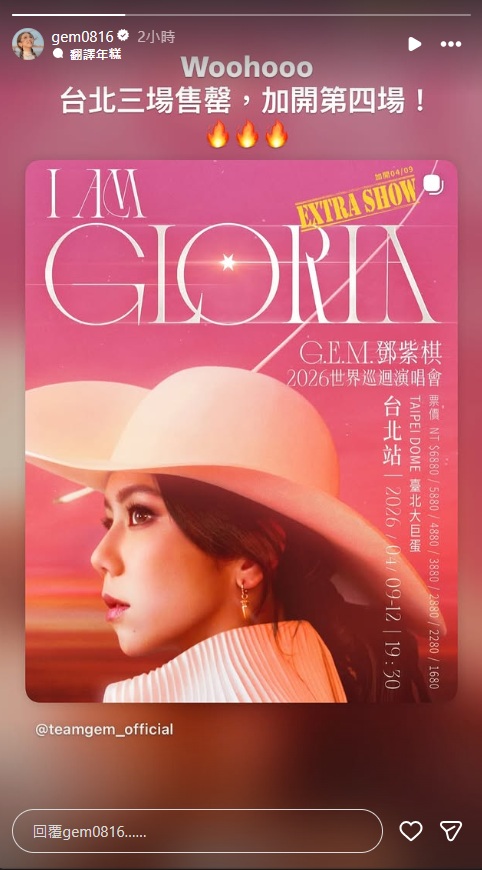 鄧紫棋開心宣布大巨蛋演唱會全數售罄再加場。圖/翻攝自IG@gem0816不過許多網友不滿直呼「超多黃牛搶票」、「應該要實名制」、「不實名制加再多場,真正的粉絲還是聽不到」!