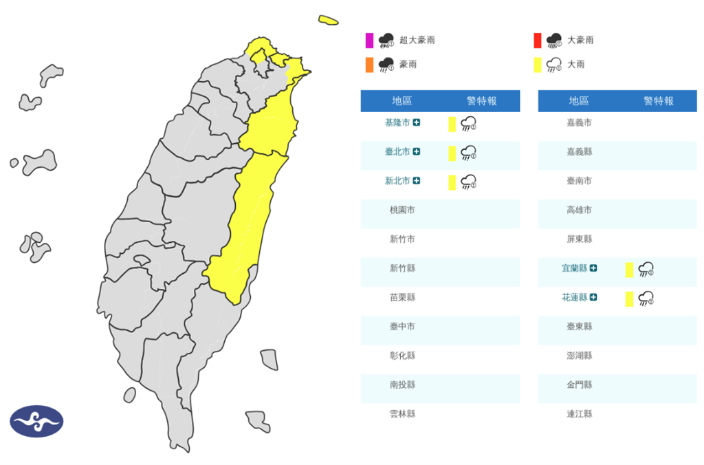 氣象署針對「5縣市」發布大雨特報。圖/翻攝自中央氣象署網站氣溫方面,寒流影響下,西半部及宜蘭低溫約8至11度,花蓮及台東12至14度,局部地區可能有10度左右或以下低溫,其中北部、宜蘭、金門及馬祖低溫時間較長,請特別注意保暖,使用瓦斯熱水器請留意通風,避免一氧化碳中毒,農漁養殖業也請慎防寒害。離島天氣方面,澎湖陰時多雲,13至15度;金門晴時多雲,7至12度;馬祖晴時多雲,6至8度。