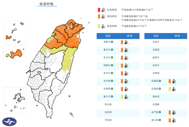 氣象署也發布低溫特報,今(8)日至明(9)日清晨受寒流影響,各地非常寒冷,局部地區有持續10度左右或以下氣溫的機率。新北市、基隆市、台北市、桃園市、新竹市、新竹縣、苗栗縣、宜蘭縣及金門縣為橙色燈號,有持續10度左右或以下氣溫發生的機率,連江縣則有持續6度左右或以下氣溫發生的機率;台中市及花蓮縣則為黃色燈號,有10度以下氣溫發生的機率,請加強保暖並注意防範。