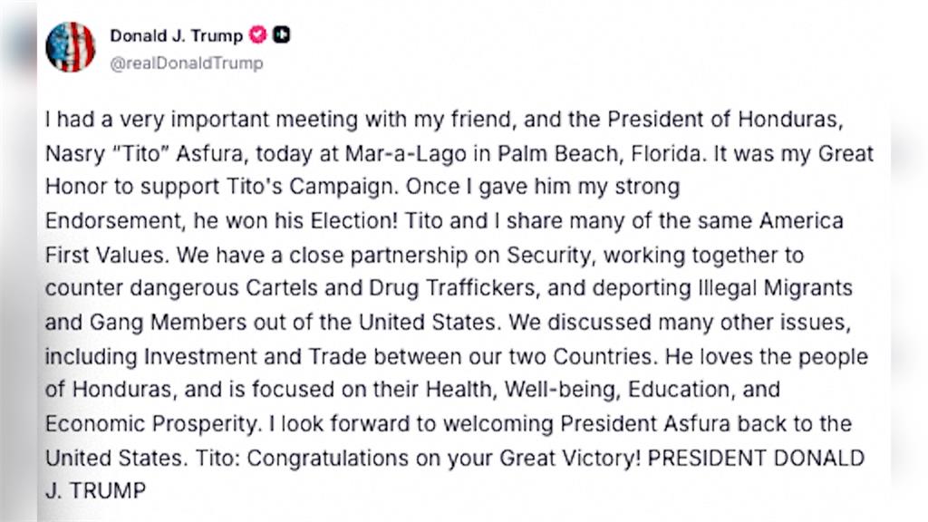 川普發文大讚阿斯夫拉。圖/翻攝自Truth social@realDonaldTrump另外,阿斯夫拉在會談後證實,他正在重新審視宏國的外交方針,考慮將外交承認從北京轉回台灣,此舉也被視為川普施壓拉丁美洲各國,在華盛頓與北京之間選邊站的重大訊號。