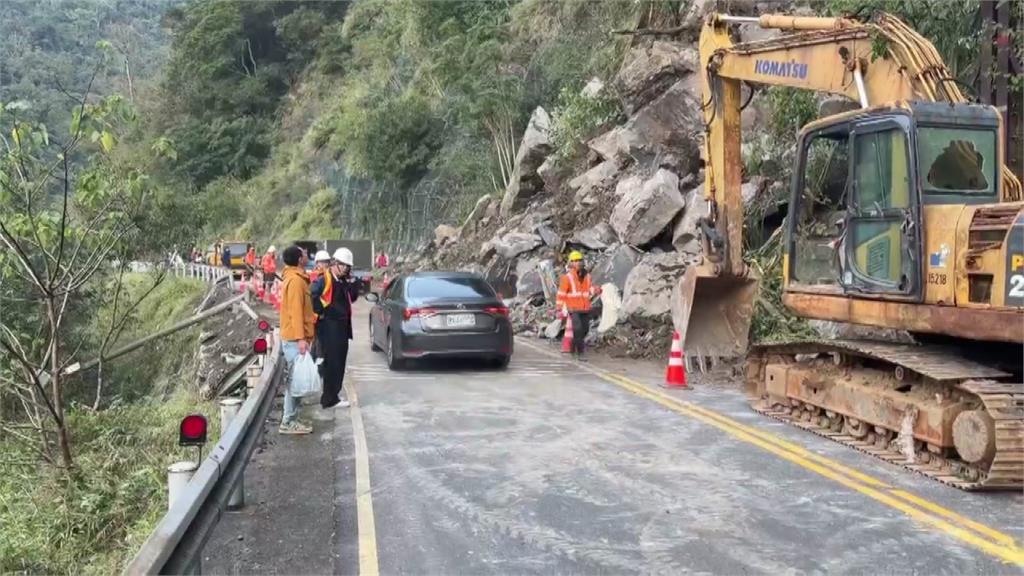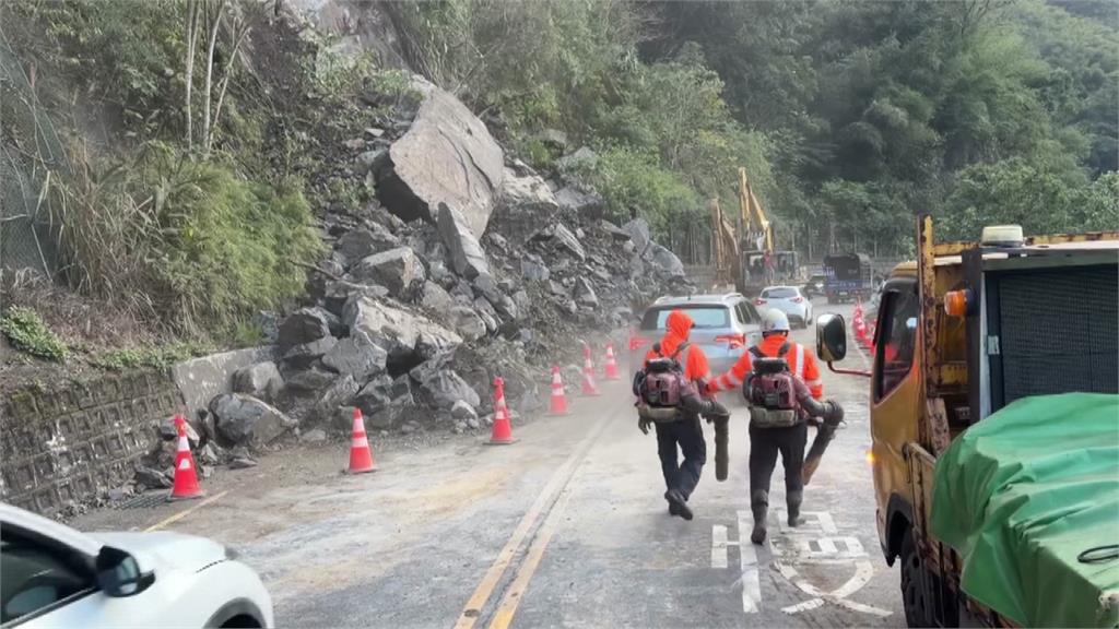 台九甲線12.4公里處凌晨有落石坍方。圖/台視新聞 新北市烏來區今(10)天凌晨2點,在台九甲線12.4公里處有嚴重坍方,多顆巨石直接阻斷雙向道路,警方接獲民眾報案後立即派員前往處理,並通報工務段協助排除,經漏夜搶修後,目前單線已可雙向通行。多顆大石與樹木直接將整條道路淹沒,完全看不到後方的道路,上方還有零星落石持續在往下滾,導致雙向車道無法通行,所幸當下並沒有人車經過,並未造成任何傷亡。中和工務段接獲通報已經在盡速排除狀況,目前單線可以雙向通行,並由員警在一旁力協助管制道路中。目前開放單線通行。圖/台視新聞新北/周芝彤 責任編輯/馮康蕙