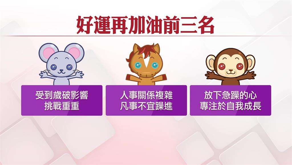 在好運再加油前三名,則是今年犯太歲的鼠寶寶、馬寶寶及猴寶寶,雨揚老師提醒肖鼠的朋友今年「受到歲破影響,挑戰重重」、肖馬「人事關係複雜,凡事不宜躁進」、肖猴的朋友則需「放下急躁的心,專注於自我成長」。