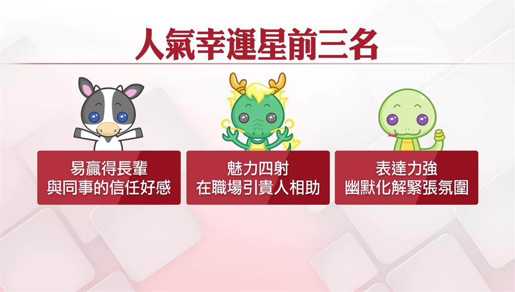 事業幸運星前三名則是虎寶寶、狗寶寶與豬寶寶,當中肖虎「事業運勢強勁,貴人助力多」、肖狗「適合求職轉換獲創業拓展」、肖豬「貴人運強,是展現自我價值的絕佳時機」;人氣幸運星前三名為牛寶寶、龍寶寶、蛇寶寶,老師指出,肖牛的朋友「易贏得長輩、同事的信任好感」、肖龍「魅力四射,在職場可引貴人相助」、肖蛇「表達力強,靠幽默化解緊張氛圍」。