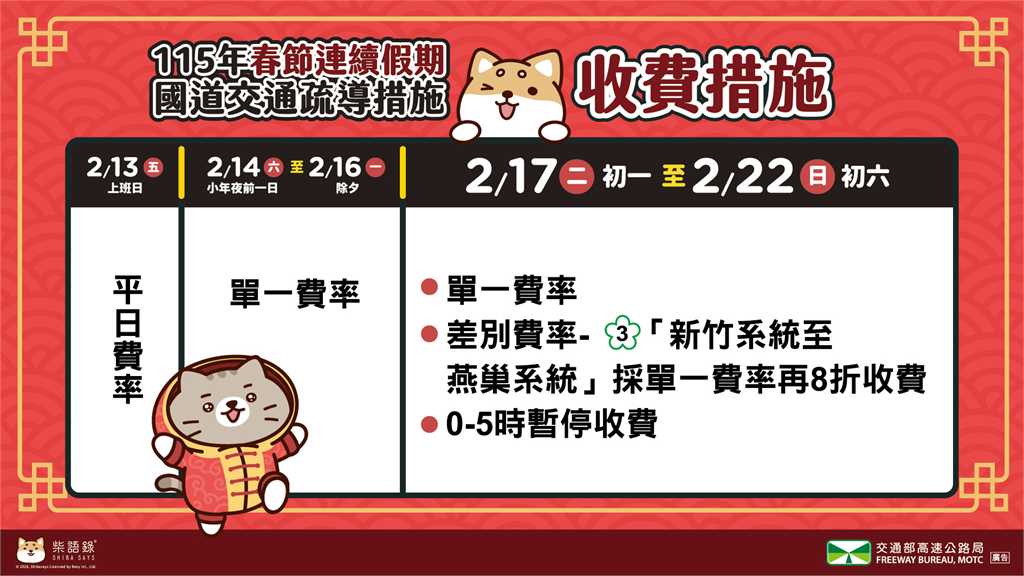 ●路段差別費率:2/17~2/22(初一~初六),國3「新竹系統至燕巢系統」採單一費率再8折收費。