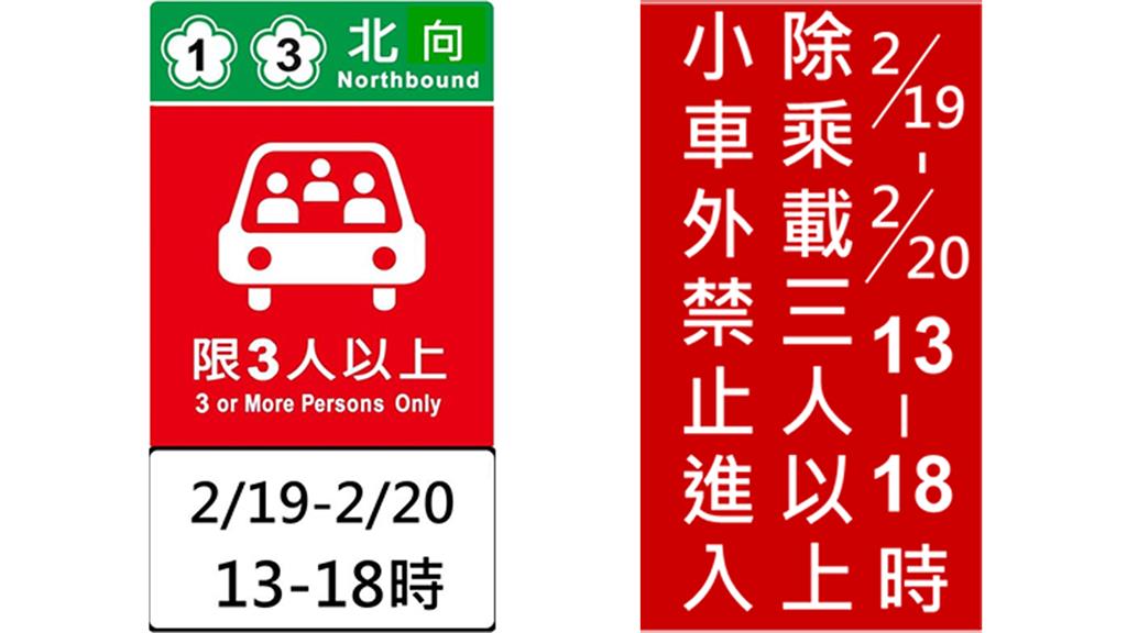 春節連假高乘載管制。圖/高速公路局提供高公局說明,設於重要路口的預告標誌,以綠底白字標示管制路線及方向,紅底白字標示管制車種及人數,並以白底黑字附牌標示管制日期與時段。簡潔明瞭,可有效縮短用路人判讀時間。至於設於匝道入口的標誌,因須作為執法依據,仍採用紅底白字的文字型禁制性告示牌。