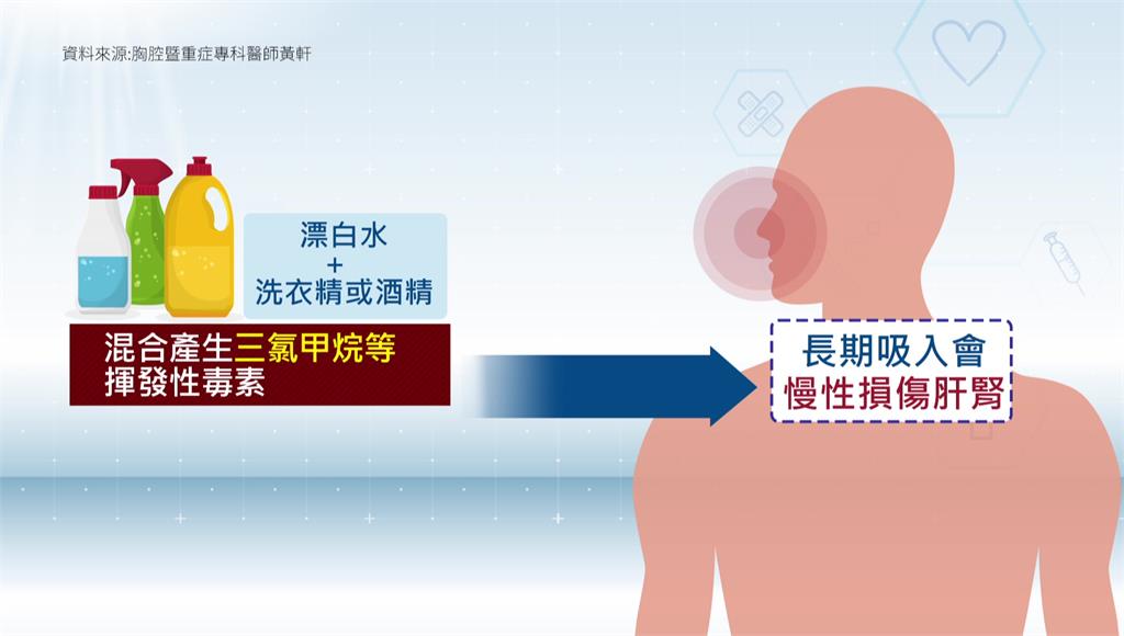 年前大掃除要記得用對清潔方法!重症科醫師黃軒提醒,使用混合清潔劑恐導致傷身。並指出漂白水碰上浴廁清潔劑恐導致灼傷肺泡,是醫療級的自傷行為。
