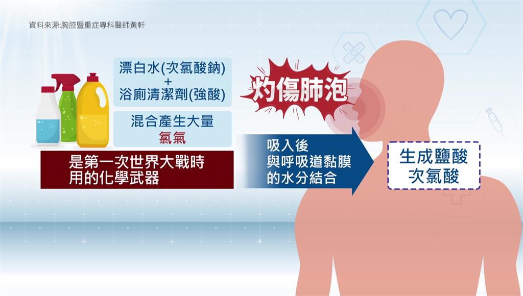 醫師黃軒透露,清潔劑兩大陷阱組合,第一個是漂白水加上浴廁清潔劑,等於是次氯酸鈉混合強酸,會瞬間產生大量的氯氣。醫師直呼,這種黃綠色氣體是第一次世界大戰時所使用的化學武器,一旦吸入會與呼吸道黏膜的水分結合,生成鹽酸和次氯酸,直接灼傷肺泡。