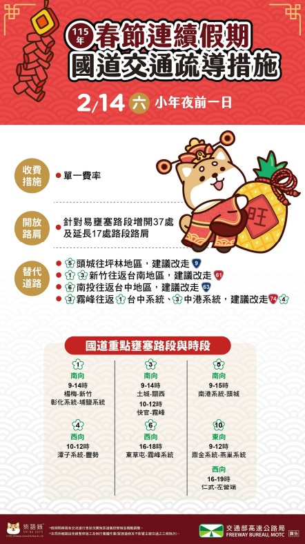 高公局表示,春節期間預估初1到初3會是南向最尖峰日,建議如果這段期間要使用西部國道的用路人,建議早上6點以前或者中午12點以後再出發上國道,如果要使用國5的話,則建議在早上5點以前或是下午5點以後;至於初3到初5則是北返尖峰日,要從南部地區出發的話,建議早上9點以前就出發,從中部地區出發則建議在中午12點以前,若要走國5的話則建議在早上9點以前。