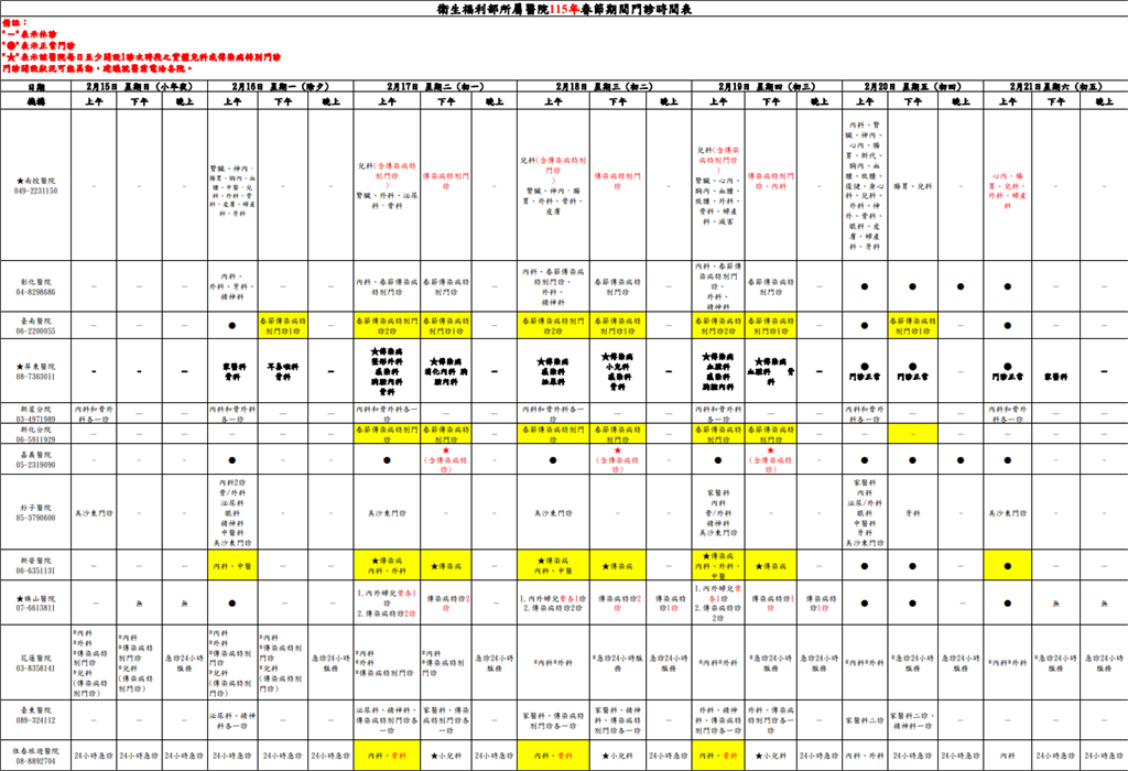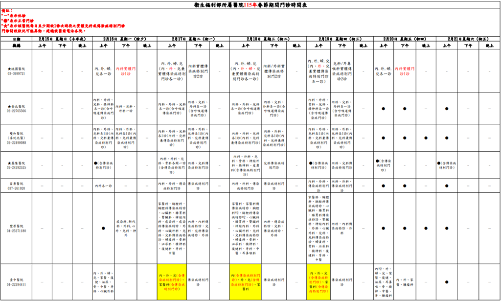 而衛福部所屬22家醫院也公告115年春節期間門診時間表,預計自15日小年夜開始,部分醫院已陸續休診,各科別開診與否,衛福部也詳列各科門診時間。