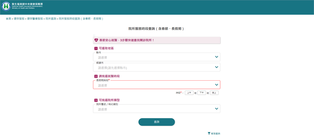 衛福部官網同樣提供查詢。圖/衛福部官網健保署表示,為提升春節期間的就醫服務量能,健保署提供「春節服務加成獎勵」,挹注獎勵費用約16億元,並確保8成直接回饋給第一線醫事人員,感謝醫療人員提供春節期間醫療照護,守護民眾健康。
