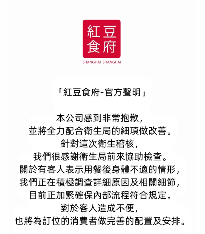 紅豆食府表示,針對有顧客反映用餐後身體不適情形,公司正積極調查原因及相關細節,同時加強內部流程,確保符合規定;對於造成消費者不便,將妥善安排後續訂位事宜。