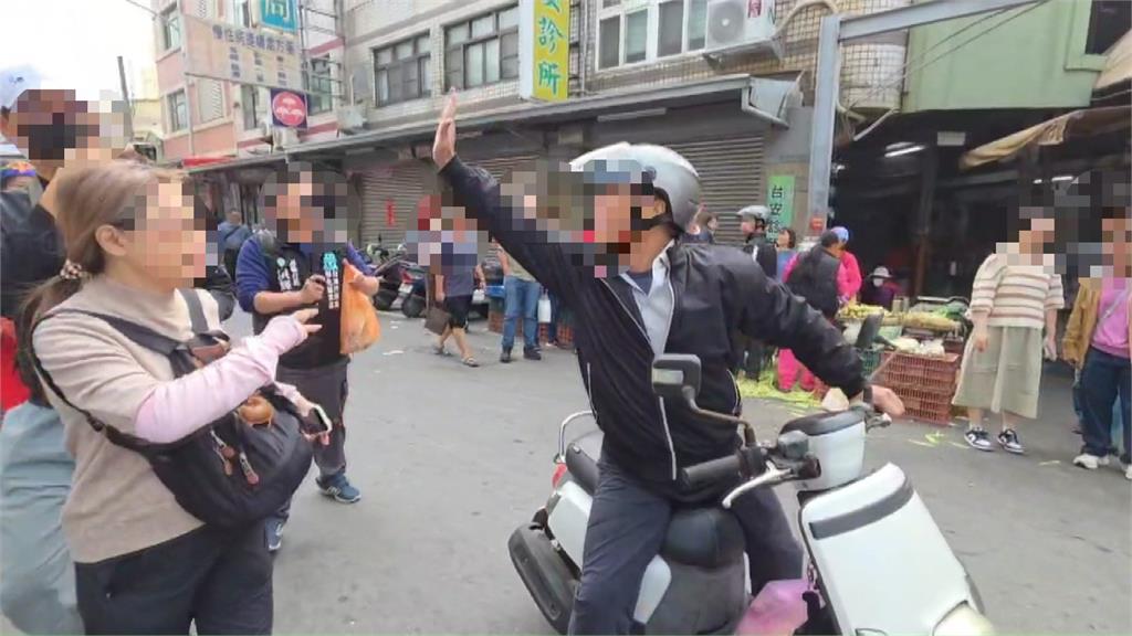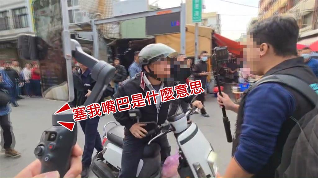 現場工作人員試圖將手上的物品塞進該名嗆聲民眾口中,現場險些進一步爆發衝突。圖/台視新聞蘇巧慧拜廟發福袋 政績影片見證林郁婷奪金