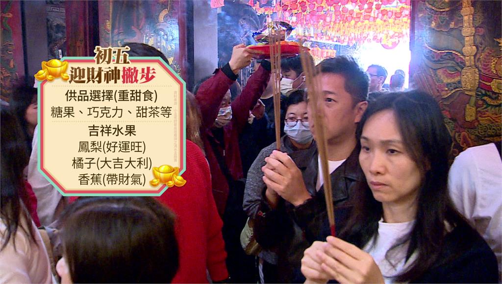 初五迎財神有撇步,專家建議,不能小氣、應大方分享供品,財神爺喜歡甜食,可以準備糖果、巧克力等等,還有代表旺的鳳梨、橘子,拜香蕉也代表賀成交,讓新春開運財氣滿滿。