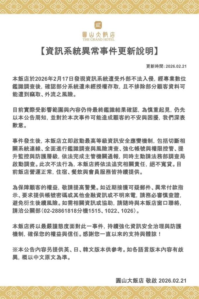 圓山大飯店公告,飯店於2月17日發現資訊系統遭受外部不法入侵,經專業數位鑑識調查後,確認部分系統遭未經授權存取,且不排除部分顧客資料可能遭到竊取、外流之風險。目前實際受影響範圍與內容仍待最終鑑識結果確認,為慎重起見,圓山大飯店仍先以公告周知,並對本次事件可能造成顧客的不安與困擾深表歉意。