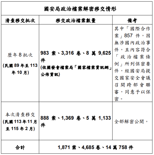 國安局表示,已將前述81年以前政治檔案全數解密,並依規定公開檔案所有內容,不予遮蔽。實體檔案經封裝成94箱,連同電子影像檔分批送交國發會檔案局,並於今日全數移交完畢。