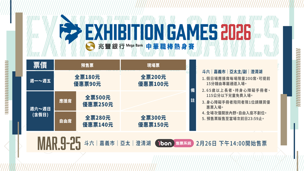 全新球季即將到來,2026兆豐銀行中華職棒熱身賽將於3月9日正式開打,六隊蓄勢待發,透過季前熱身賽提前暖身,為新賽季做好準備。今年熱身賽賽事規劃以中南部為主,亞太主、副球場也將首度加入熱身賽使用場地,全新球場的啟用成為本次賽事一大焦點。