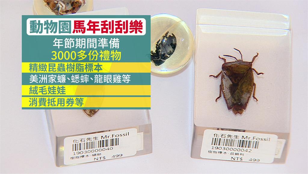 今年過年期間,台北市立動物園應景推出馬年刮刮樂活動,民眾消費滿額就能換一張、拿禮物,獎品包含消費抵用券,還有各式昆蟲標本,包括蟑螂、蟋蟀、龍眼雞等。