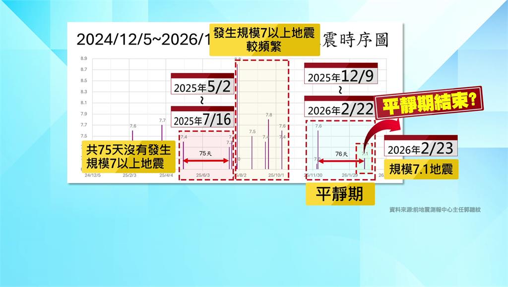 回顧去年5月2號到7月16號,一共75天沒有發生規模7以上地震,後續3個月內發生規模7以上的地震,就變得較頻繁;而去年12月8號日本青森一帶發生規模7.6地震後,全球已經有76天,沒有發生規模7以上地震。因此郭鎧紋認為,23號馬來西亞附近發生規模7.1的強震後,可能顯示地震平靜期已經結束。
