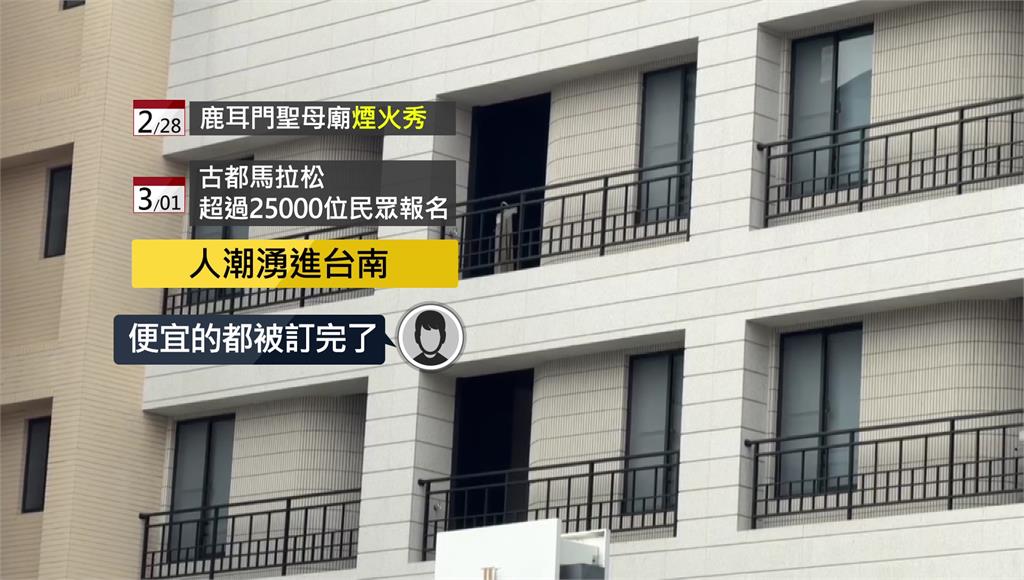 飯店房價會這麼貴,原因是228當晚剛好遇上鹿耳門聖母廟的煙火秀,而隔天還有古都馬拉松,賽事吸引國內外超過2萬5千位民眾報名。人潮湧進台南,才使得飯店空房少,帶動房價。