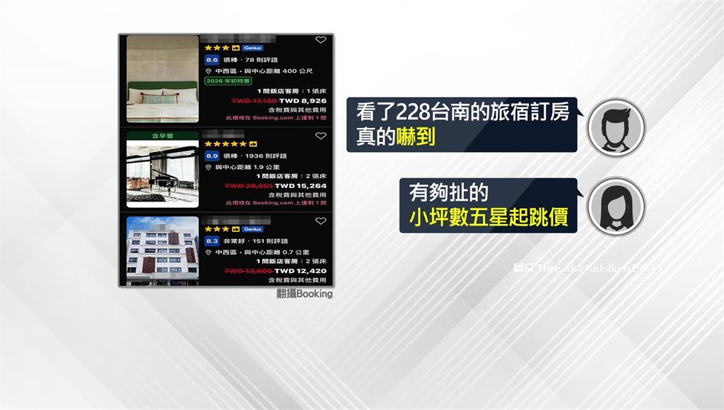 228連假即將來臨,有民眾發現台南旅宿的房價相當高,不少飯店雙人房一晚就要價8千多元,好一點的更動輒上萬元!原來是這次228假期碰上鹿耳門聖母廟的煙火秀以及古都馬拉松,人潮大量湧進台南,房價才跟著水漲船高。對此,台南市觀旅局將展開調查,確認業者不得超過備查房價。