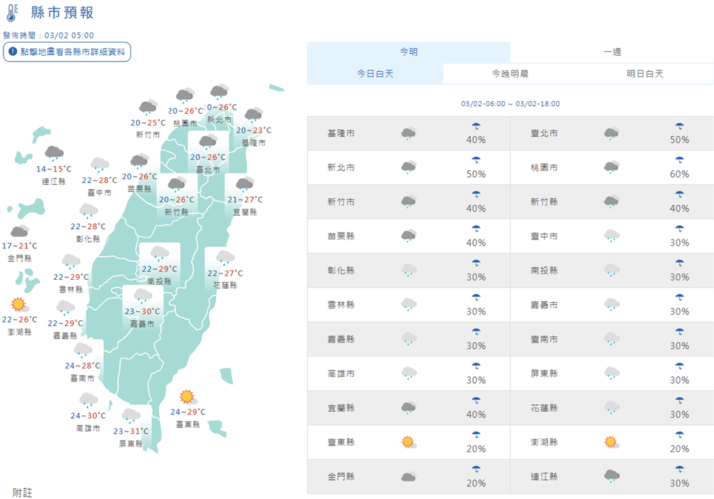 今日縣市天氣預報。圖/翻攝自中央氣象署網頁