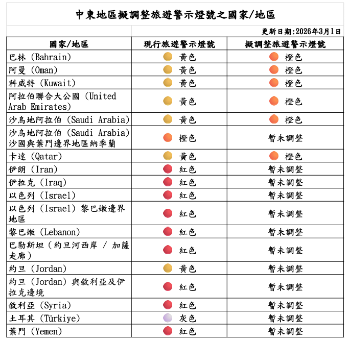 中東戰火急遽升溫,外交部也緊急宣布自3月1日起調整旅遊警示燈號。除了以色列、伊朗、伊拉克、黎巴嫩、約旦、敘利亞和葉門維持紅色警示以外;卡達、阿拉伯聯合大公國、科威特、沙烏地阿拉伯、巴林與阿曼,皆上調為橙色警示,外交部也提醒國人多留意自身安全。