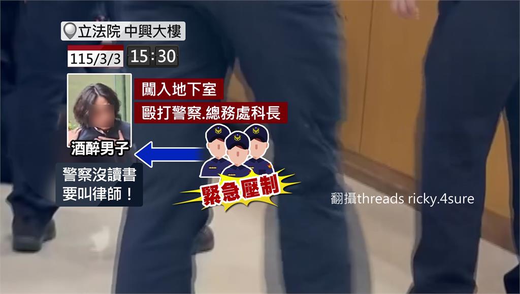 醉漢擅闖立法院,還襲警、攻擊院方人員!今(3)日下午3時許,一名酒醉男子從中興大樓地下一樓試圖進入時,疑因不願配合換證程序情緒失控,當場辱罵員警,並動手攻擊警察及總務處科長。支援警力到場後將其壓制帶回,警方將依妨害公務罪嫌送辦。