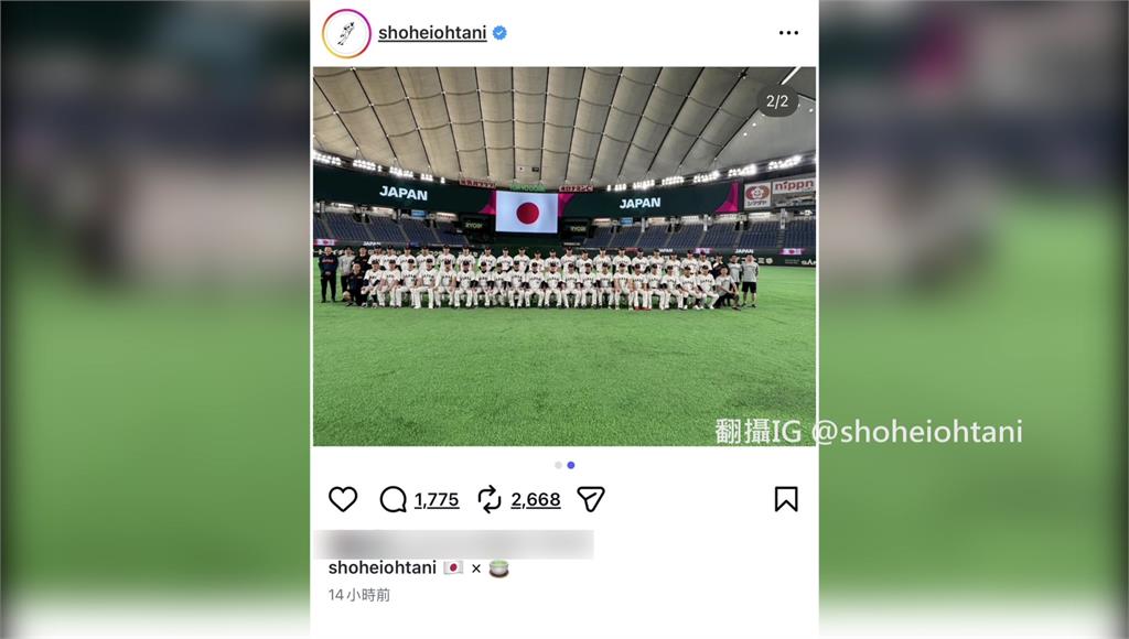大谷翔平在IG貼出日本國旗跟抹茶兩個符號,代表「點茶」慶祝手勢。圖/翻攝自Instagram@shoheiohtani台勝利手勢「抓手腕」 陳傑憲:代表心繫在一起