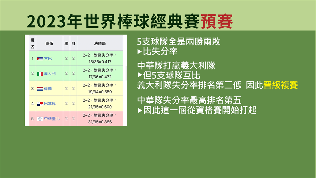 這也讓不少網友想起,上一屆經典賽預賽時,當時中華隊所屬的A組5支球隊全是兩勝兩敗,也是比失分率,結果敗給中華隊的義大利,最後也順利晉級到複賽,跟這次韓國同樣在預賽上輸給台灣,但最後也晉級的情況一樣。