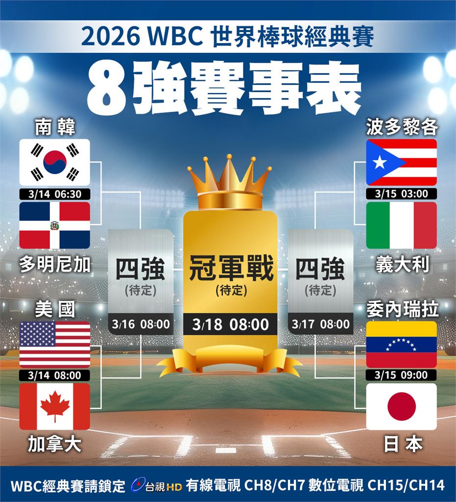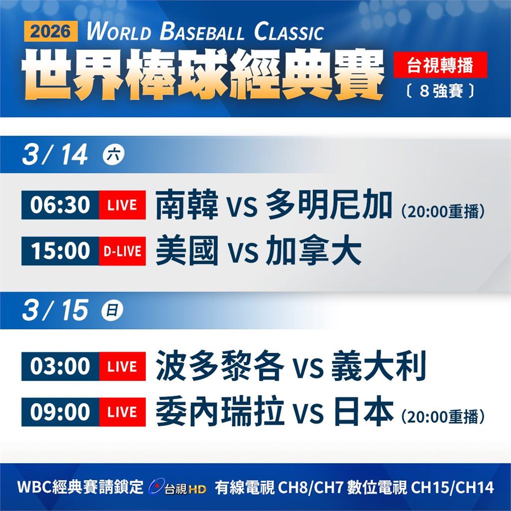 WBC賽事ABCD小組前兩名出爐,將進入八強對戰,分別是A組加拿大、波多黎各;B組義大利、美國;C組日本、南韓;D組多明尼加、委內瑞拉,不過今天休戰,明天開始將展開八強賽事,《台視新聞》整理一次看,以下為台灣時間。