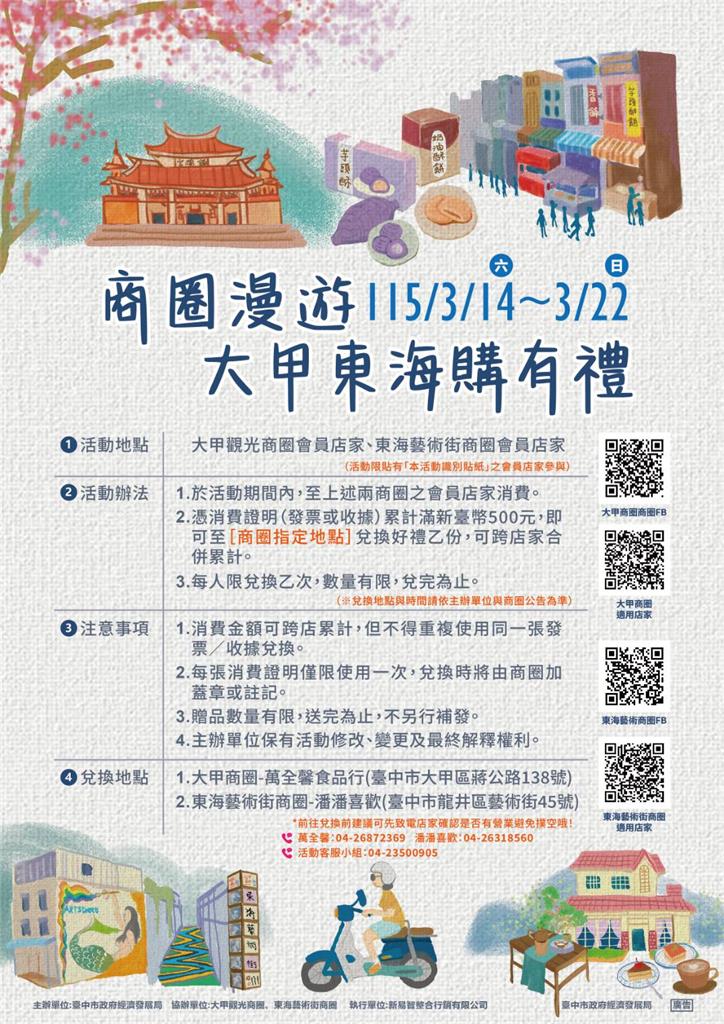 時值春暖花開之際,臺中市政府經濟發展局於大甲商圈及東海藝術街商圈推出「商圈漫遊・大甲東海購有禮」活動,只要在115年3月14日起至3月22日活動期間至商圈會員店家消費滿額500元即可兌換精美好禮1份,邀請民眾與好友、親子一同出遊走訪特色商圈,體驗在地文化特色之餘,消費購物還能換好禮,為春日假期增添更多驚喜!