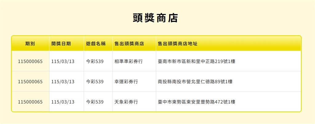 今彩539頭獎開出3注,每注中獎獎金800萬,分別由台南市新市區「相準準彩券行」、南投縣南投市「幸運彩券行」、台中市東勢區「天象彩券行」開出。