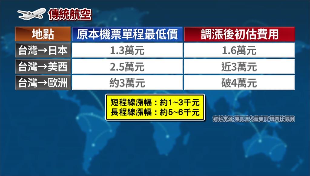 有專家初步估計,以台灣旅客最常前往的日本為例,傳統航空單趟機票原本平均最低約1.3萬元,未來調漲後可能來到1.6萬元;若飛往美西,單趟票價可能接近3萬元;飛往歐洲,單趟未來也可能突破4萬元,整體來看,從台灣出發的短程航線可能上漲約1千至3千元,長程航線約增加5千至6千元。