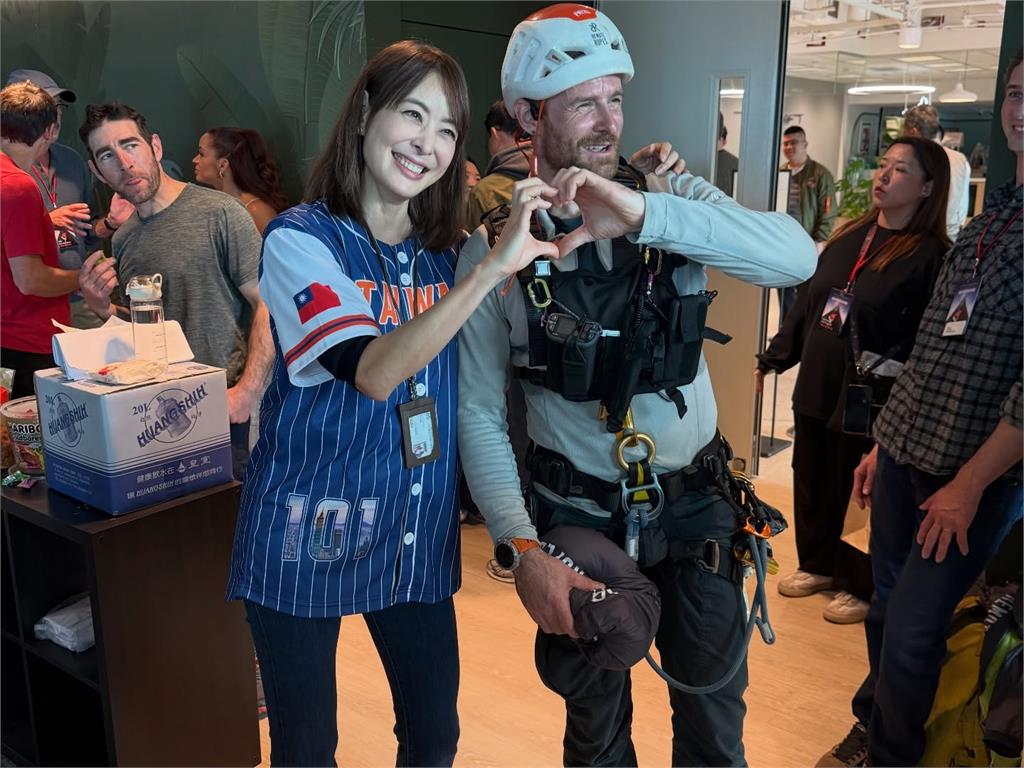 賈永婕與霍諾德攀登101團隊合照。圖/翻攝自賈永婕臉書其實這些繩索一開始並不存在,所有繩索、配備、支點,都是利用力學臨時架設,且101大樓更嚴格規定「不能破壞大樓,一個洞都不能鑽」。