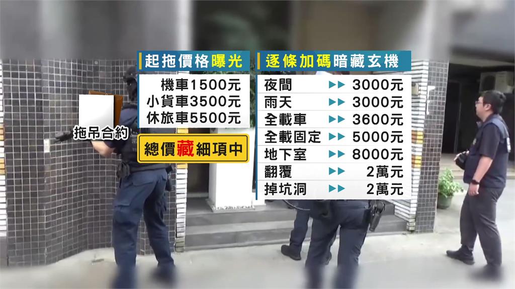 雙北桃園陸續爆出拖吊蟑螂案,業者都是先口頭告知看似合理的價格,殊不知合約裡頭暗藏「加碼條款」,夜間出車要多收錢,遇到下雨天再加成,還有坑洞、翻覆、地下室等加成項目,光是市區拖吊就收費民眾數萬元。