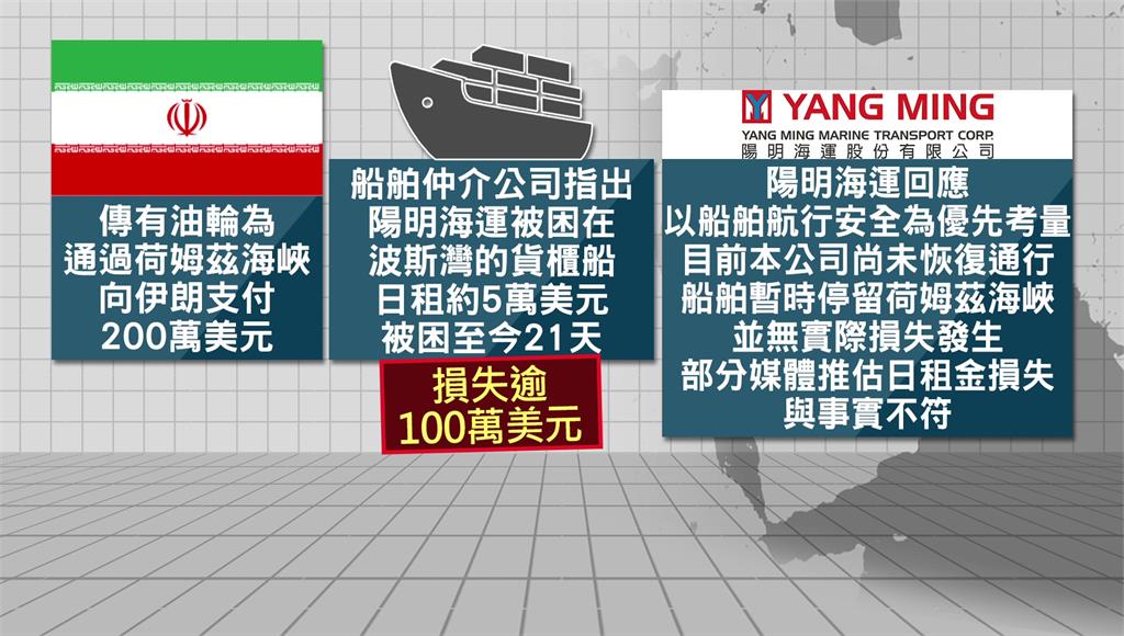 中東衝突升溫,通行荷姆茲海峽成為高風險路線,甚至傳出有油輪為通過海峽,向伊朗支付200萬美元。另有媒體報導,陽明海運有貨櫃船受困於荷姆茲海峽21天,若以日租約5萬美元推算,損失逾百萬美元。但陽明海運表示,船舶目前僅暫時停留,並無實際損失,媒體推估與事實不符。