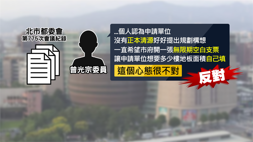 而從京華城案的都委會會議紀錄中可看到,曾光宗委員曾經發言,申請單位沒有「正本清源」,好好提出規劃構想,一直希望市府開一張「無限期空白支票」,讓申請單位想要多少樓地板面積「自己填」,心態很不對,直接反對。