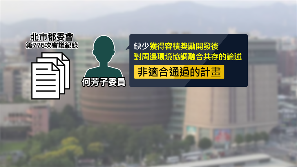 另外,何芳子委員也曾經說,京華城案缺少獲得容積獎勵開發後對周邊環境協調融合共存的論述,不是適合通過的計畫,這些專家的說法到最後通通消失。
