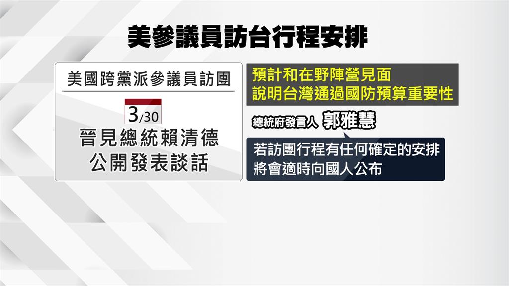 美國跨黨派參議員訪團預計30日晉見賴總統並公開發表談話,不過總統府發言人郭雅慧表示,若有任何安排會適時向國人公布。圖/台視新聞對於國防特別預算條例,國民黨立委牛煦庭表示,「現在軍購條例最重要的是,如何從立場的表達,進入到共識的建立,那我想有更多的意見交換,也許有助於這樣的一個過程。」民進黨立委陳冠廷則表示,「我相信這一次的參議員訪問,也應該會提醒台灣,我們對於這些政策的重視度,也會影響到美國對台灣未來的長期支持度。」
