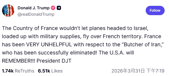 隨後川普又再發文點名法國,指出美軍在執行消滅伊朗屠夫行動時,法國政府相當不配合,甚至不允許滿載軍用物資飛往以色列的飛機飛越法國領空,因此怒批法國「表現得非常沒幫助」(VERY UNHELPFUL),並強調「美國會記住這一切」。