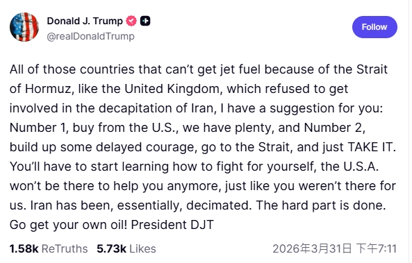 川普在貼文點名因荷姆茲海峽封鎖無法獲得航空燃油的國家,「例如拒絕參與摧毀伊朗的英國」,並給出2個選擇,第1個是從美國購買,我們石油充足;第2個是「佔領荷姆茲海峽」。