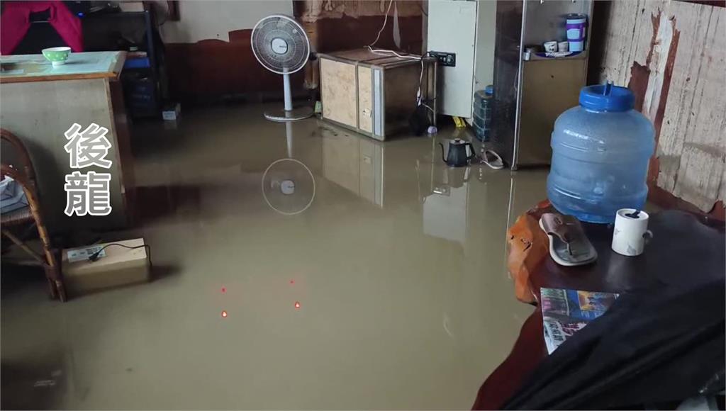 後龍鎮一間汽車保養廠,水位也一度達50公分,廠內汽車、機具全被水淹過,損失慘重,老闆、老闆娘整夜沒闔眼,忙著清理善後,只希望這雨趕快停。