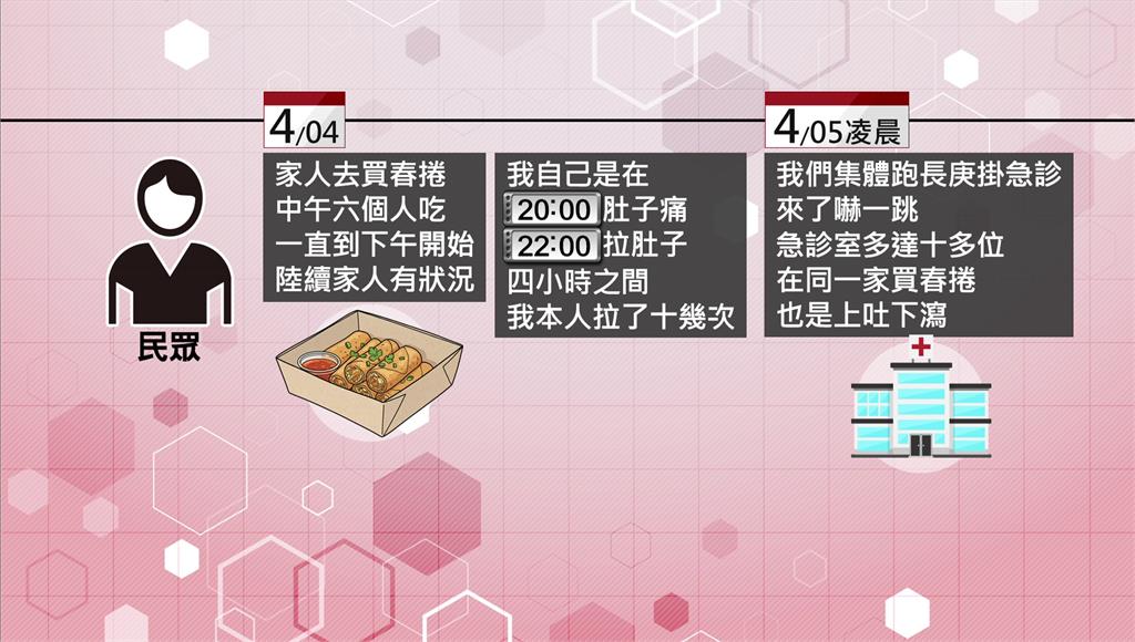 有民眾在網路上發文抱怨,4日家人去買春捲,中午6人吃後,下午開始陸續出現不適,自己更是在4小時內就腹瀉了10多次,5日凌晨6人更集體跑去長庚掛急診。原PO還發現急診室內十多位民眾也是在同一家買春捲,上吐下瀉就醫。