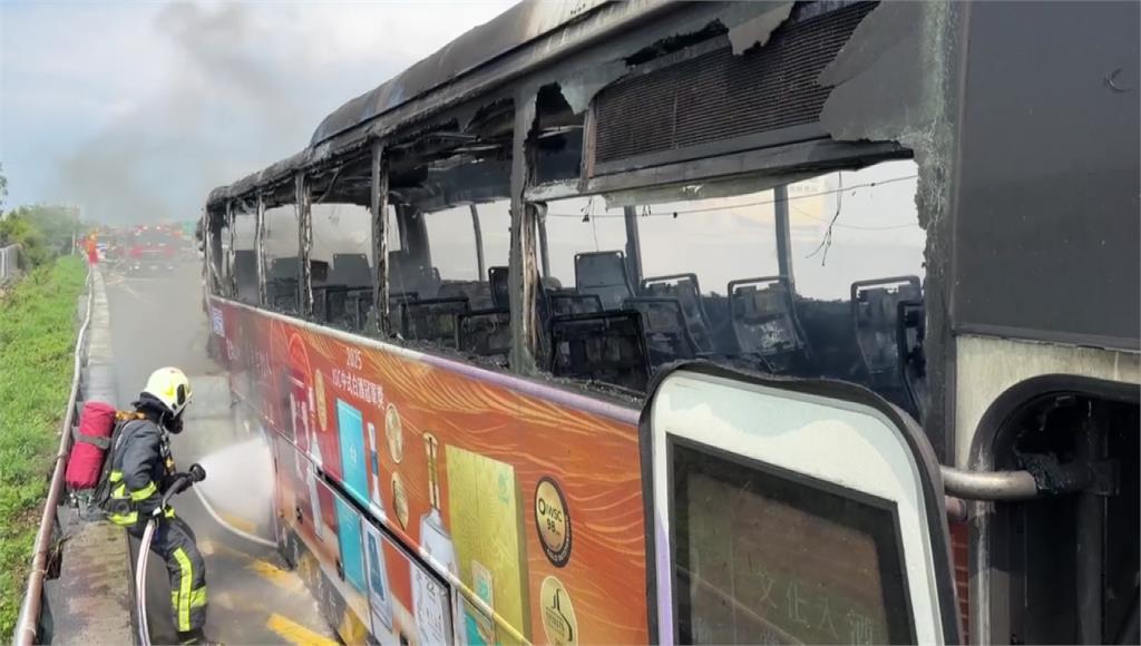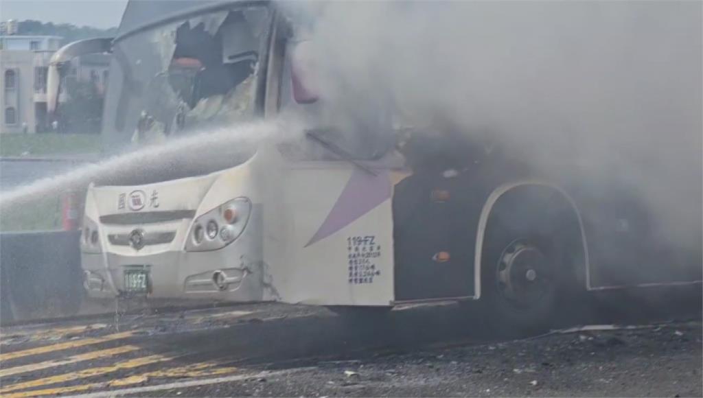 消防隊獲報後趕抵撲滅火勢。圖/台視新聞這起事故發生在國道1號南下134.5公里苗栗往銅鑼路段。客運司機表示,自己行駛到一半時,引擎突然發出怪聲,緊急停靠路邊後,就發現車尾冒煙起火。