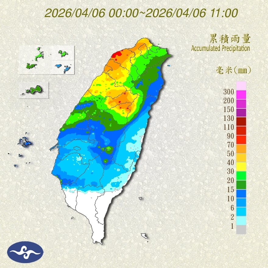 氣象署對10縣市發布大雨特報。圖/翻攝自中央氣象署 受到鋒面影響,易有短延時強降雨,今(6)日苗栗以北地區及臺中、南投、花蓮山區有局部大雨發生的機率。氣象署已對10縣市發布大雨特報,雨區擴大延伸至中部、東部,包括基隆、台北、新北、桃園、新竹市、新竹縣、苗栗、台中、南投、花蓮。民眾外出記得攜帶雨具,須注意雷擊及強陣風,山區請慎防坍方及落石,低窪地區請慎防積水。今日0時至11時全台累積雨量。圖/翻攝自中央氣象署責任編輯/施佳宜