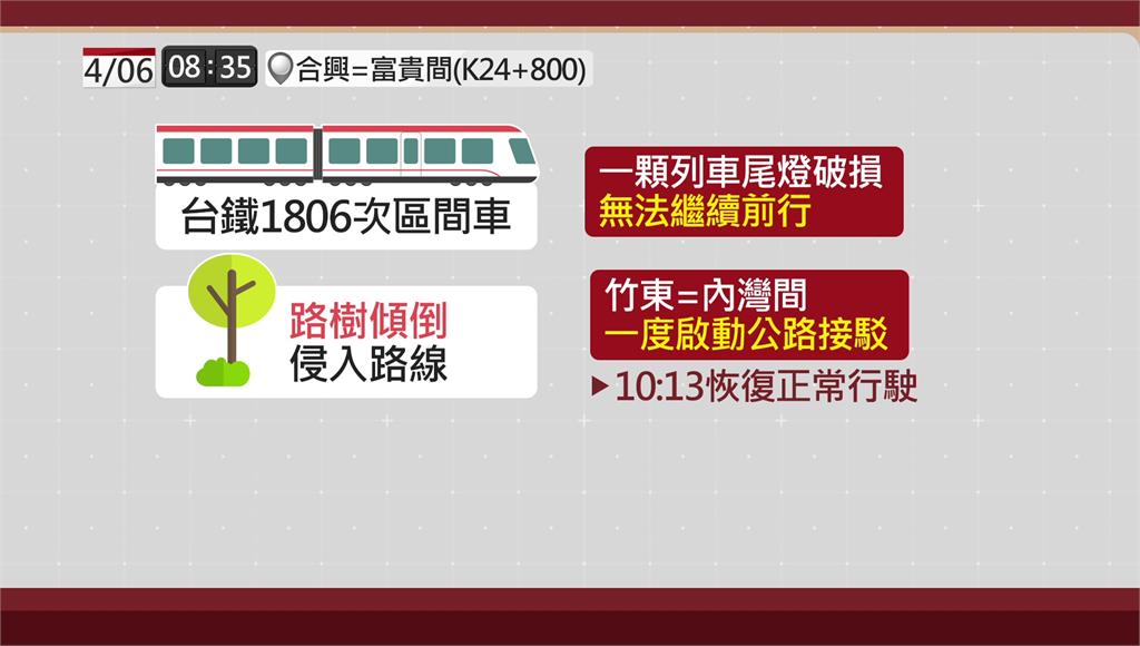 另外,台鐵內灣線今(6)日上午8點多,1806次區間車行經合興至富貴路段時,撞上傾倒、侵入軌道的樹木,造成列車尾燈破損,無法繼續行駛。